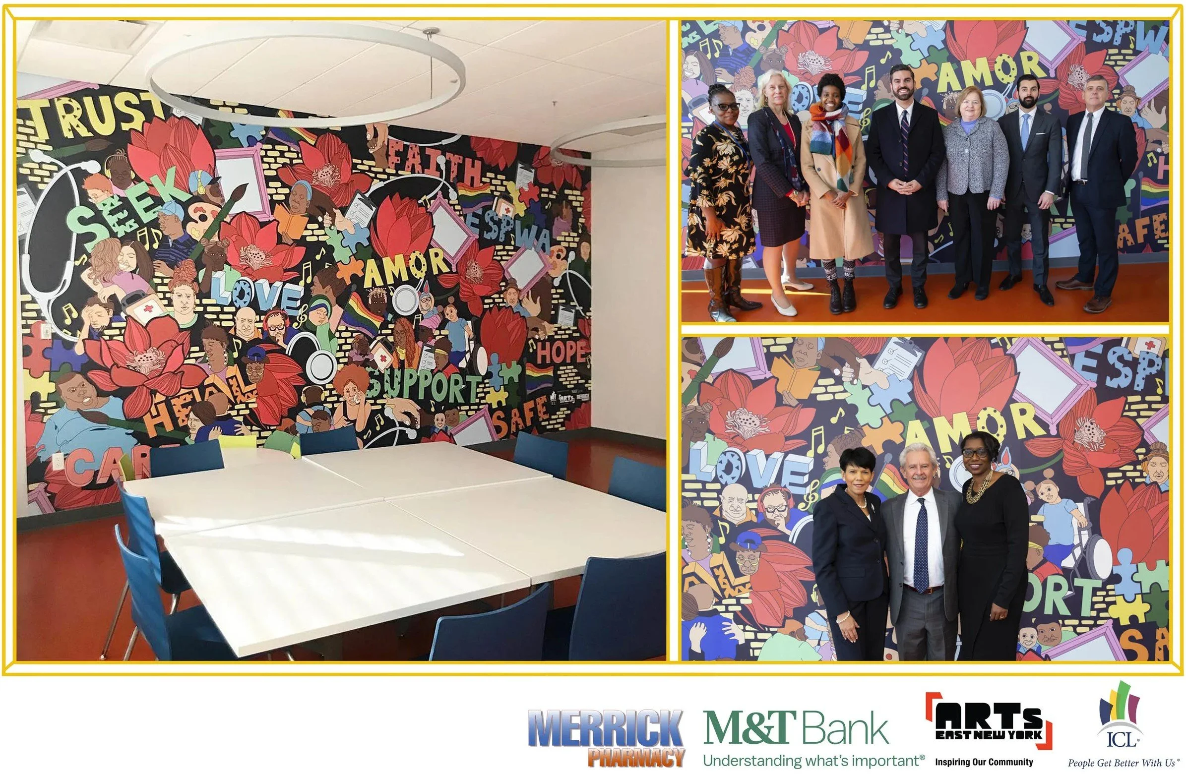 Mural located in the Family Resource Center room at the ICL Health Club, 90 Georgia Avenue Brooklyn, NY. Artwork design inspired by community focus group discussions. Commissioned by Arts East New York andICL (Oct. 2018 - Present)