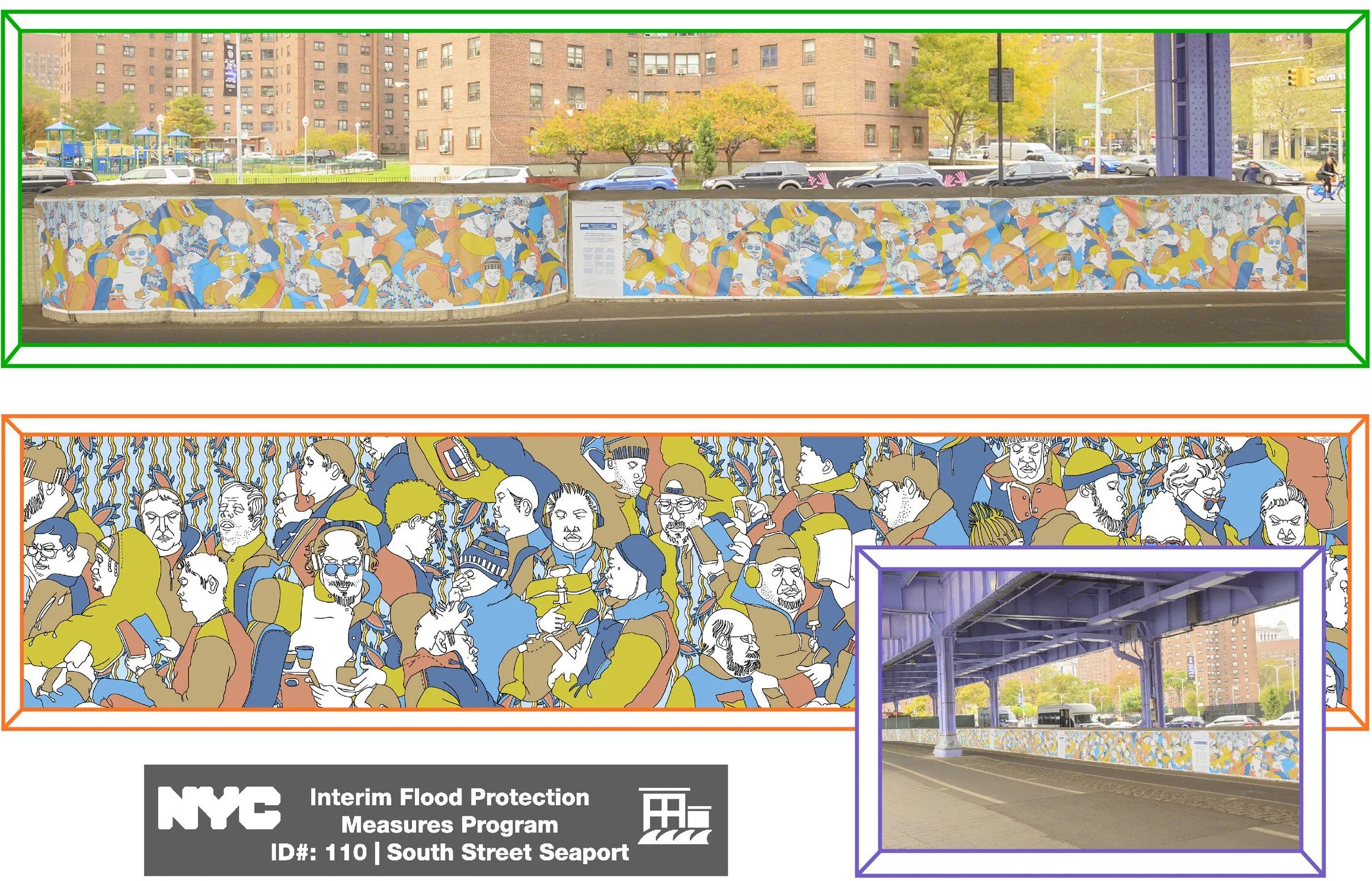 Taking Flight Reimagined, at South Street Seaport Community Flood Banners Project. Sponsored by the Manhattan Borough President’s Office in partnership with New York City Emergency Management and the Mayor’s Office of Resiliency. Located near the Catherine Slip along the Brooklyn Bridge Esplanade (Fall/Winter 2019).
