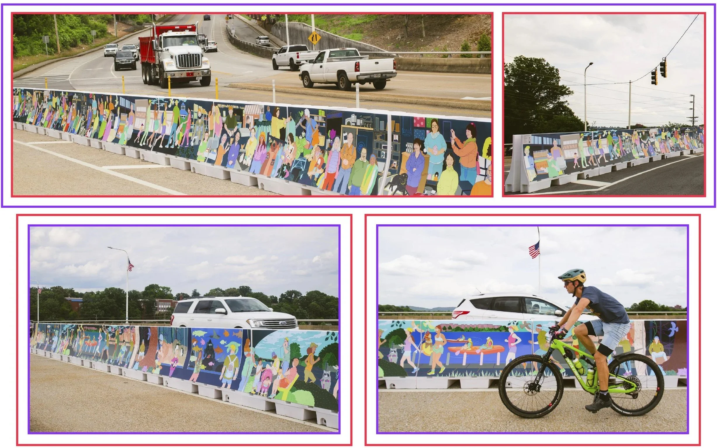 Temporary public art project, Love to Chattanooga (2025), is featured on the Veterans Memorial Bridge in Tennessee. The project is in collaboration with Via Partnership and City of Chattanooga. The repeating artwork is featured on a total of 60 barriers in 4 sections of the bridge. The design faces the pedestrian/cyclist route. This is a temporary lane created as an alternative to Walnut Street Bridge being closed for renovations. Each section represents a different theme: art, nature, recreation and shopping. Photography by J.Adams