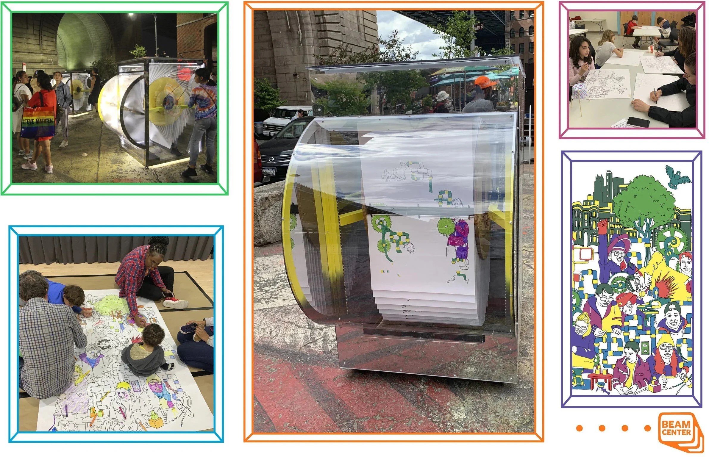 Collaborative Beam CenterNYC Flipbook project located at the Pearl St. Triangle in Brooklyn, NY. Architect of the flip books: Chee-Kit Lai, (Jun. 2019 - Sept. 2019). Bottom Left Image: Beam Center Inventgenuity Festival at the Dock Street School in Dumbo, Brooklyn. (May 2019)