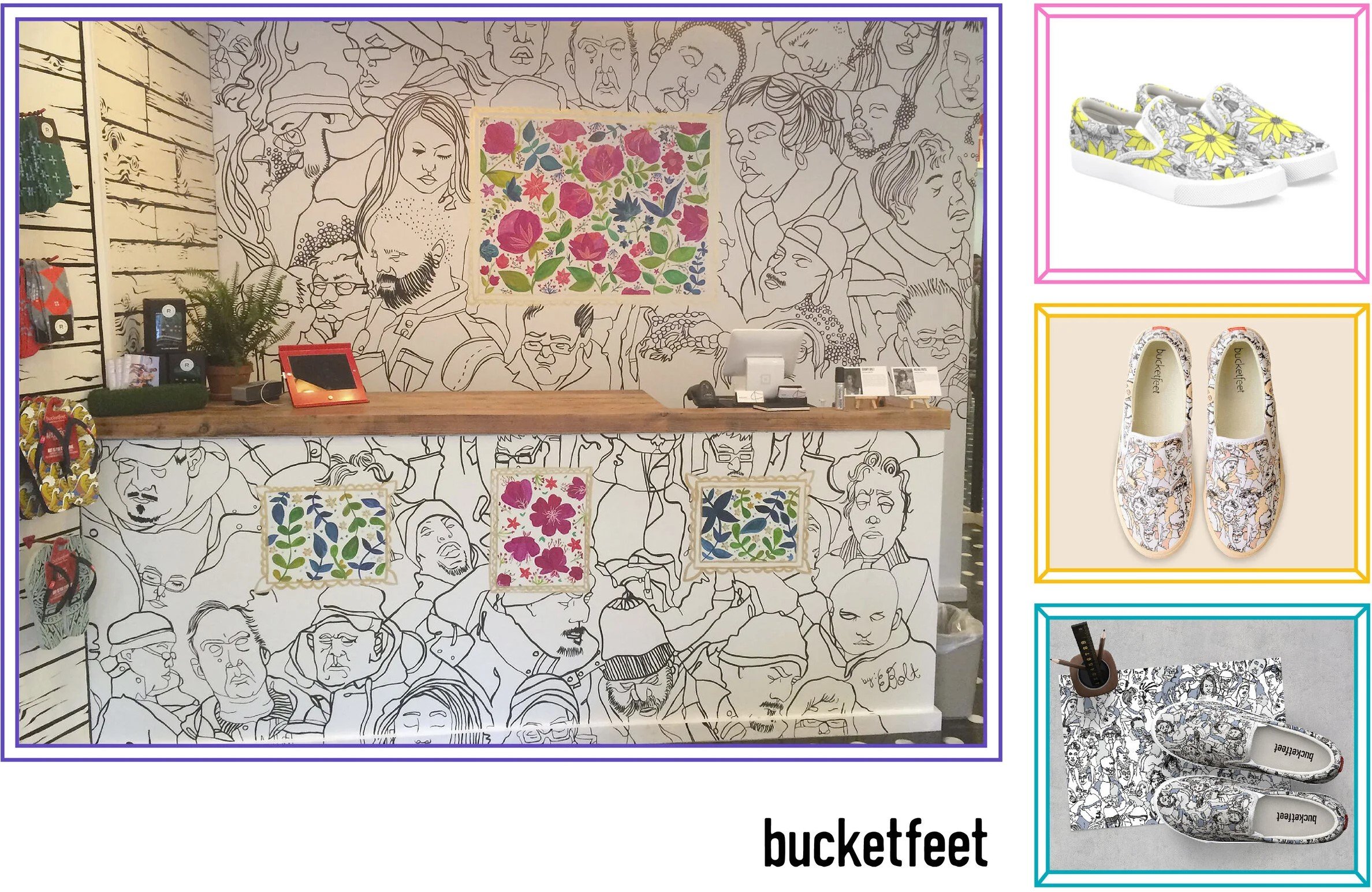 Bucketfeet Nolita Pop Up Shop Mural in collaboration with artist Meera Lee Patel (May 2015) Floral People Slip On Sneaker (2019), Neutral Peeps Slip On Sneaker (2019), Neutral Peeps Slip On Sneaker in Blue (2019)