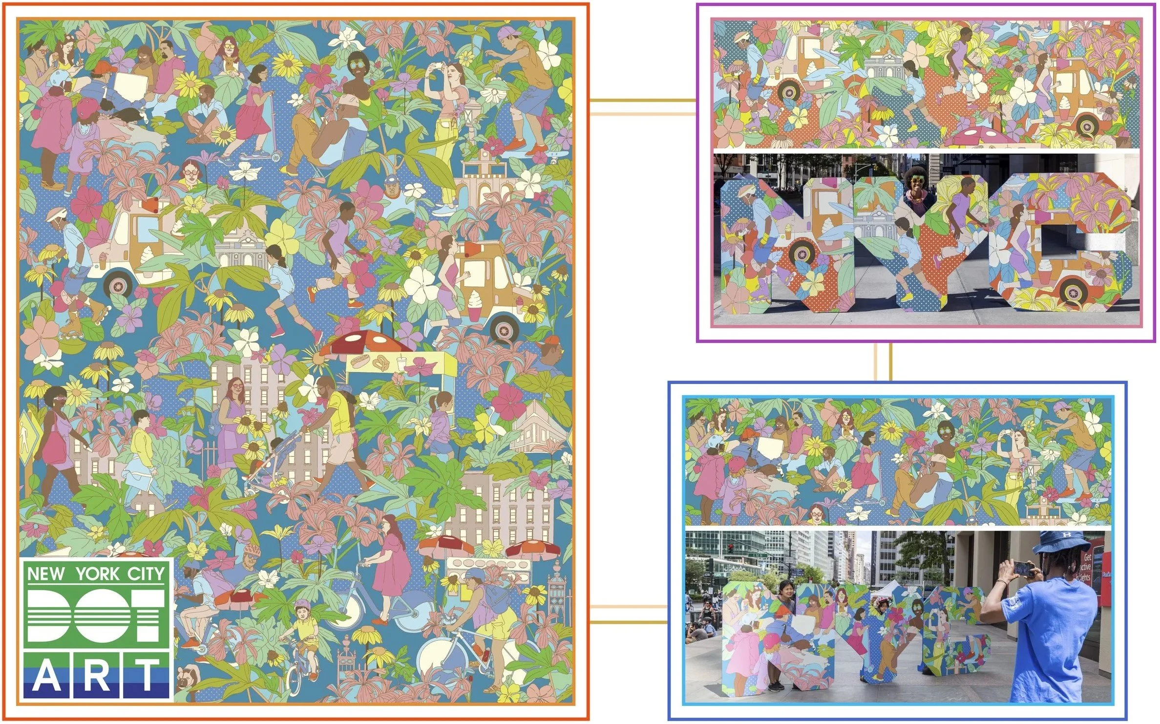 Play, Run, Walk, Bike, (2022), created for Summer Streets 2022 in collaboration with NYC DOT Arts. Design was used on the NYC letters at each, “Art Stop,” along Park Avenue in Manhattan, during the first three Saturdays in August.