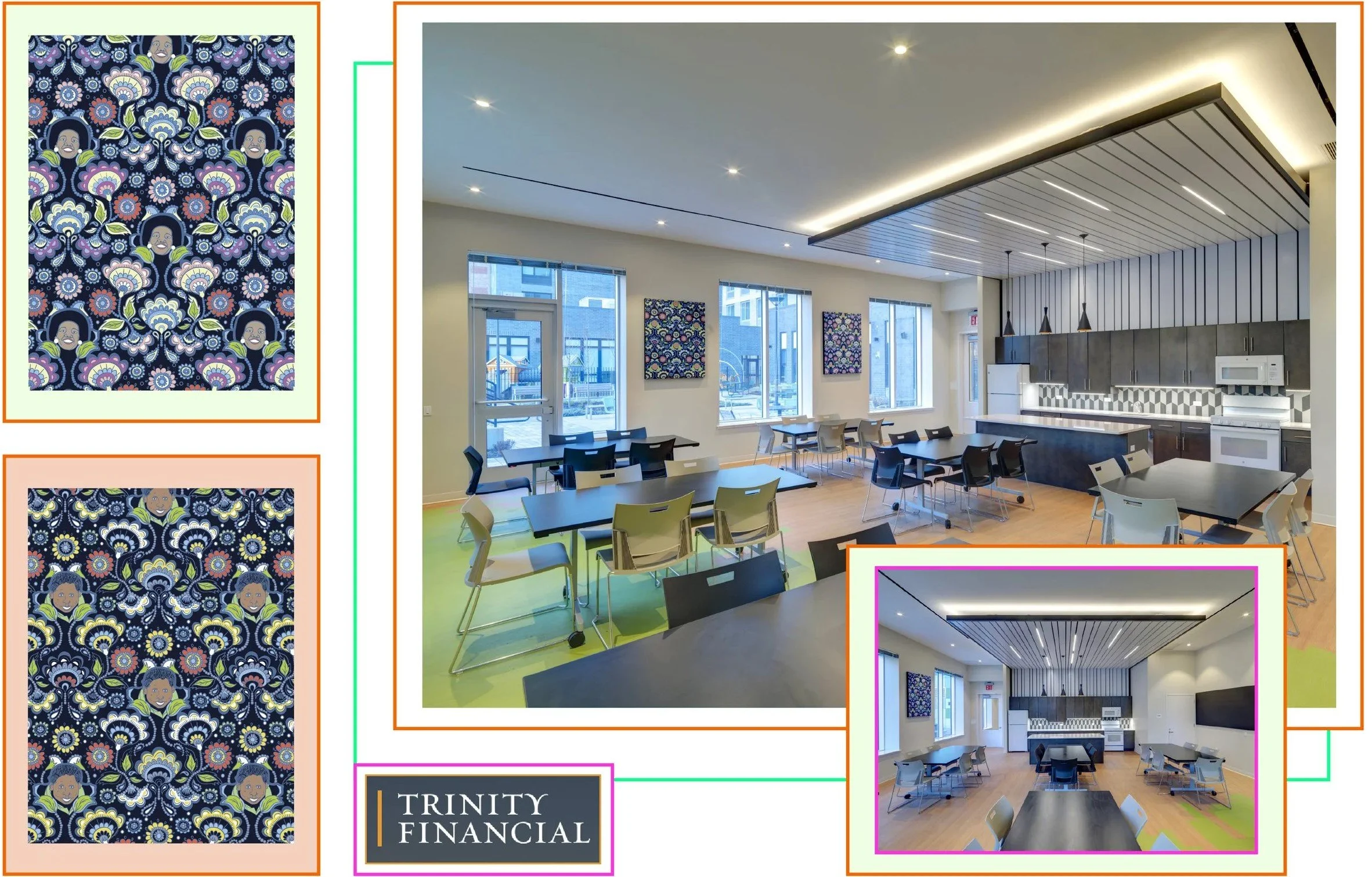 Framed artwork featuring designs, Folk Woman and Folk Man at the community room of Trinity Financial’s Van Dyke III housing development. The property is located in Brownsville, Brooklyn. Ribbon cutting occurred November 2021. Photographs by Andy Ryan