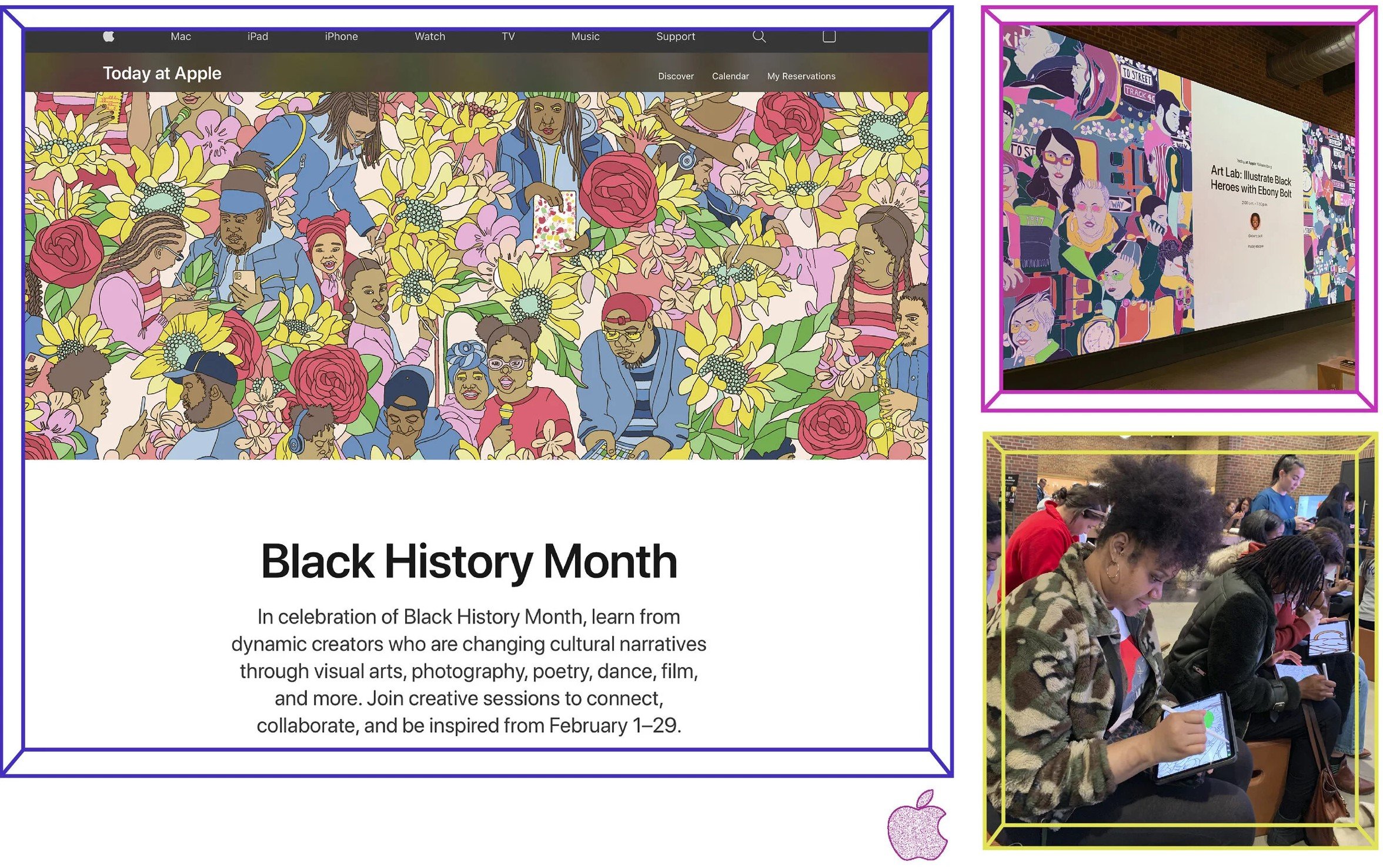 Left Image:Commissioned illustration, Creative Connections, for 2020 Black History Month programming for Apple.com Right Images: Today at Apple Coloring Workshop Session in Williamsburg, Brooklyn (Feb. 2020)